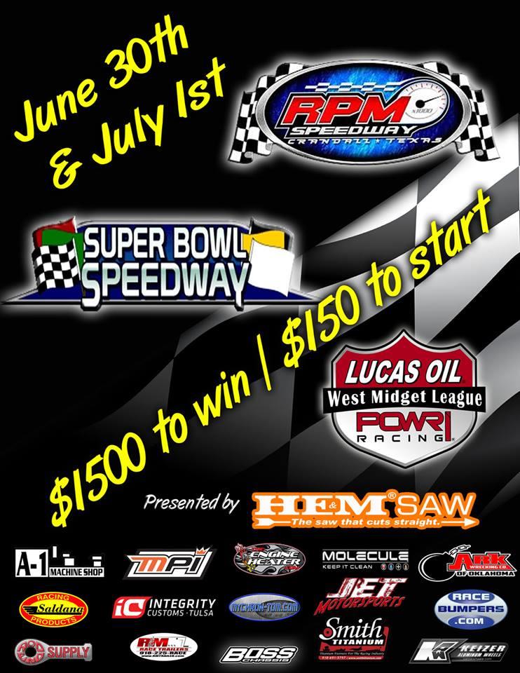 Tulsa, OK (June 22, 2017) As the season heats up, it’s time for the Lucas Oil POWRi West Midget League presented by HE & M Saw to head to the great state of Texas for the first time this season. After an exciting night of racing just a few weeks ago at I-44 Riverside Speedway, the officials with POWRi West are looking forward to another great weekend of racing on the Texas dirt.