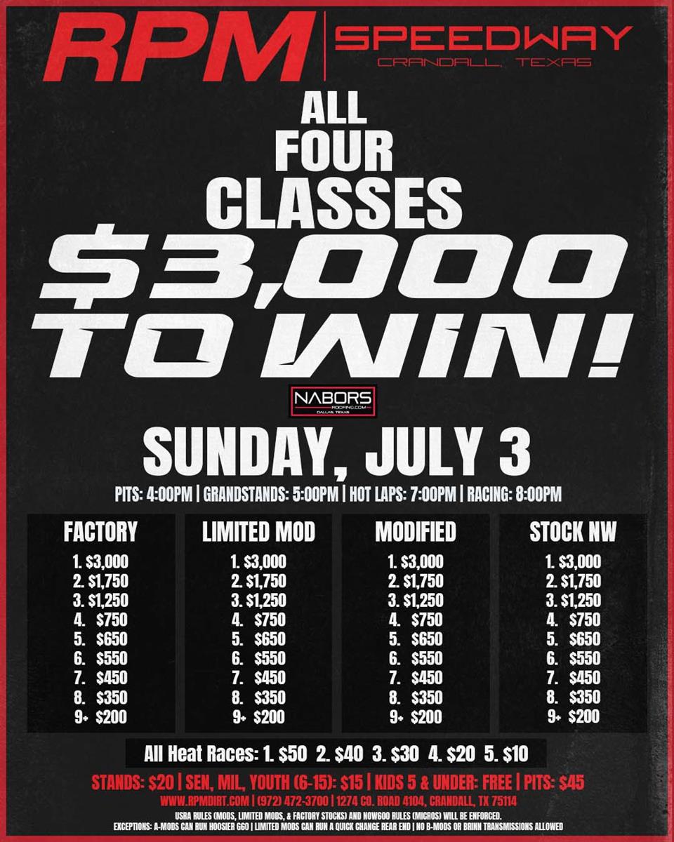 For more information, email zach@slnabors.com, log onto http://www.rpmdirt.com, or follow RPM Speedway at https://www.facebook.com/rpmspeedwaycrandall.